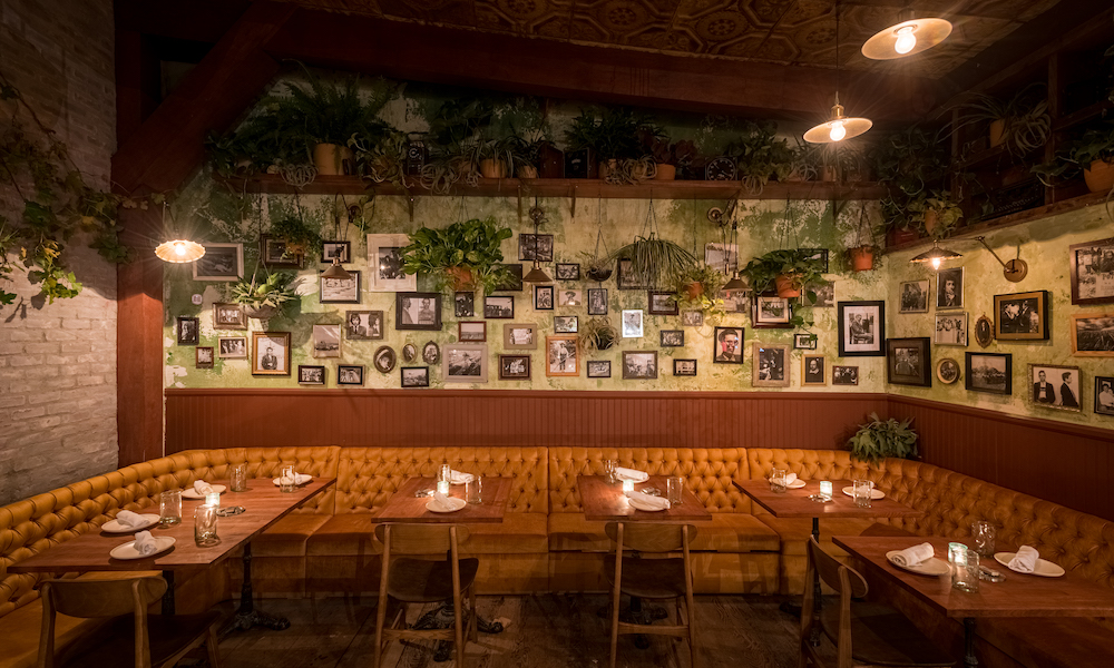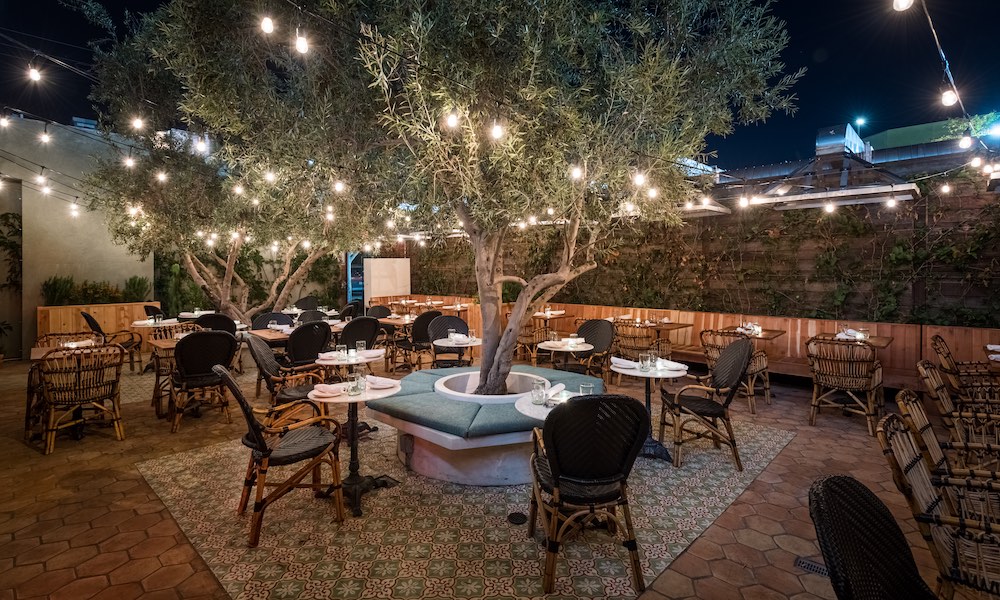 From the hostess stand, the restaurant is cleverly divided into several spaces. To the right, a charming patio opens in front of an indoor-outdoor bar with dark, moody speakeasy-like seating behind it. The patio’s courtyard is flanked by trees and ventilation hoods designed to (somewhat effectively) minimize the smokiness, and in the center, a mature olive tree provides both shade and a California chic atmosphere. Directly behind the host stand, a gate opens up onto another courtyard, which was booked that day with a private event, and is planned to be sectioned off into a “separate” bar space in the future, where alcohol will be sold, per the notice of application posted on the restaurant’s front wall.