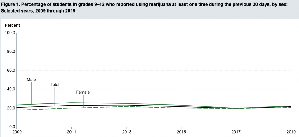 This time, the U.S. Department of Education’s National Center for Education Statistics (NCES) analyzed youth surveys of high school students from 2009 to 2019, concluding that there’s been “no measurable difference” in the percentage of those in grades 9-12 who reported consuming cannabis at least once in the past 30 days.