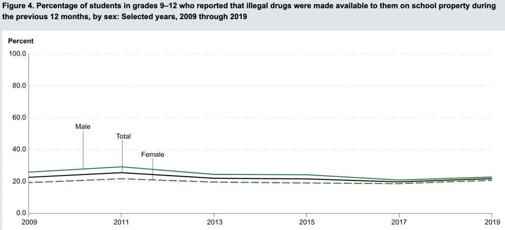 Further, there were “no measurable difference between 2009 and 2019 in the percentage of students who reported that illegal drugs were made available to them on school property,” NCES said.
