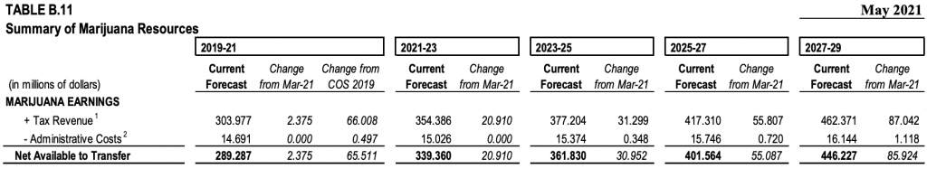 The latest projections for cannabis tax revenue the state will generate in the 2019-2021 biennium is about $304 million. That will continue to increase each biennium, reaching $462 million in 2027-2029, the analysis says.