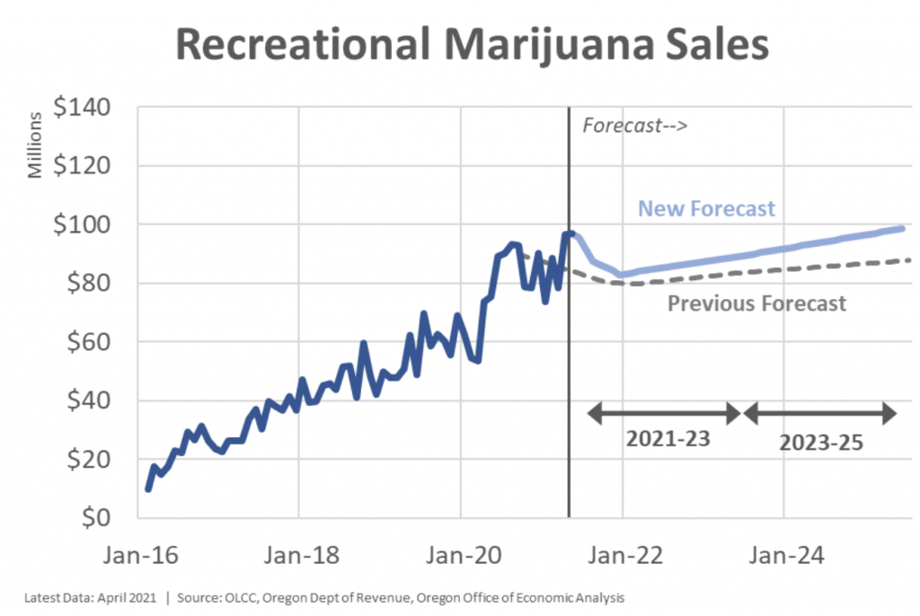 Marijuana sales in Oregon have remained strong—even throughout the past year’s global pandemic—and they’re expected to continue to grow, the state projected in a new economic forecast report.
