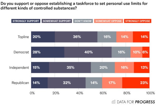 A new national poll from Data for Progress and The Lab, a policy vertical of The Appeal, found that more than seven in ten voters (71 percent) believe that federal drug policies are not working and that there is a need for reform. Voters no longer want to treat public health issues like drug use and addiction as matters of crime and law enforcement—they support decriminalizing both drug possession (59 percent support) and the distribution of drugs in small quantities (55 percent support), while also shifting regulatory power over drugs from the Drug Enforcement Agency to the Department of Health & Human Services (60 percent support).
