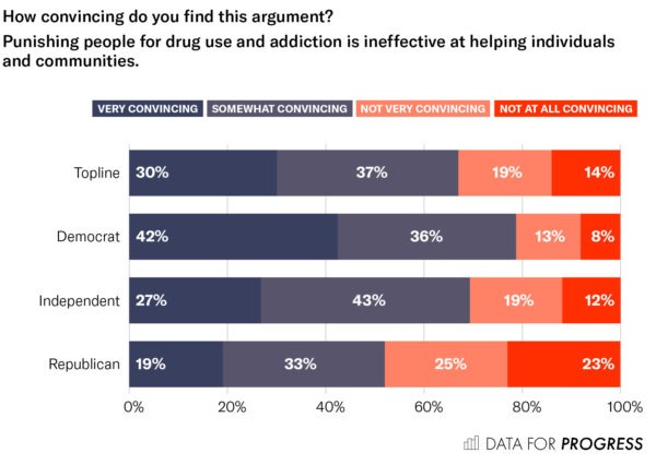 - 67 percent of likely voters find it convincing that punishing people for drug use is ineffective at helping individuals and communities.