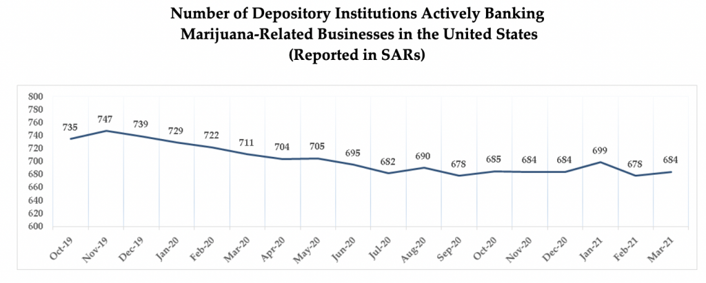 As of March 31, there were 684 banks and credit unions that filed reports saying they were working with cannabis clients. That’s the exact same number from the previous quarter, though it’s still down from a peak of 747 in late 2019.