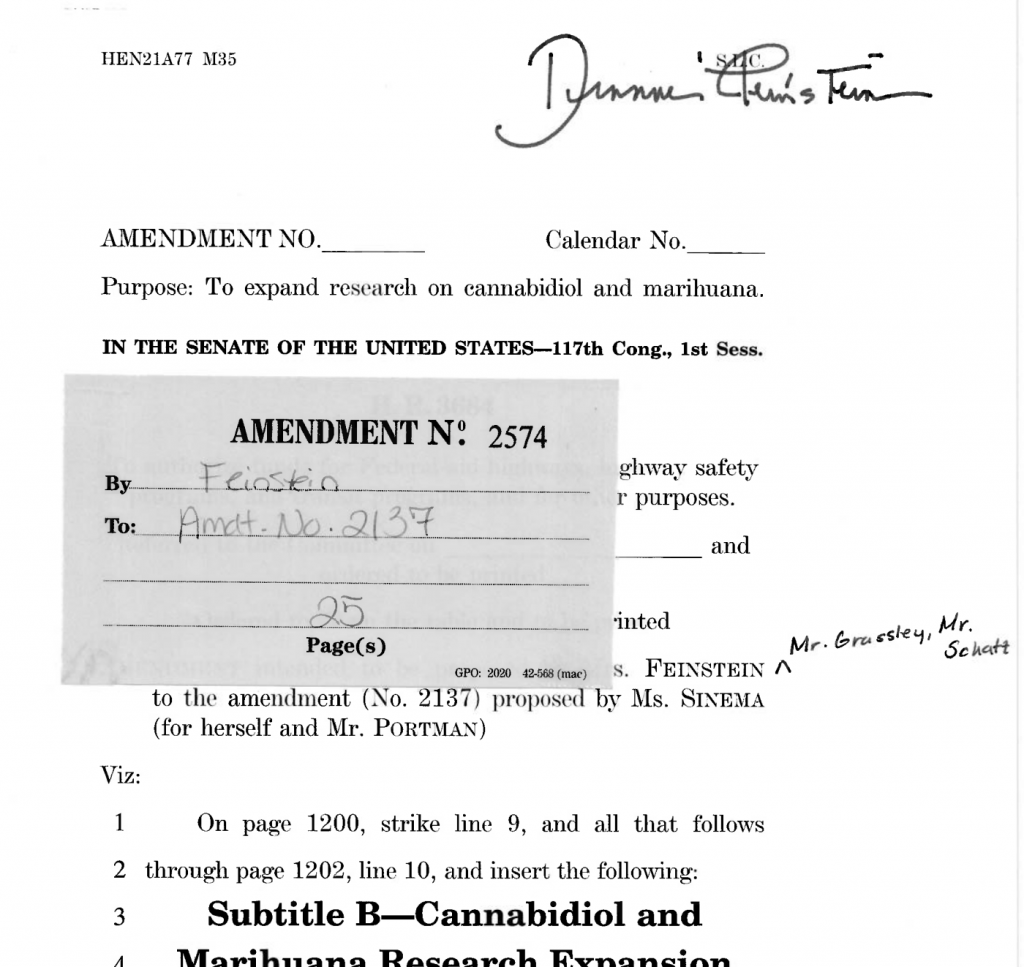 The new amendment, proposed Wednesday by Sen. Dianne Feinstein (D-CA), would streamline the application process for researchers who want to study cannabis as well as manufacture the plant for research purposes. It’s titled the Cannabidiol and Marihuana Research Expansion Act and has bipartisan support in cosponsors Sens. Chuck Grassley (R-IA) and Brian Schatz (D-HI), who were added in a handwritten note.