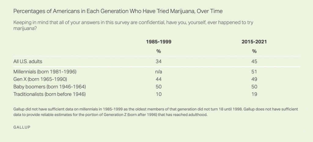 “The percentage of Americans who have tried marijuana has steadily climbed in recent decades,” Gallup said. “Soon it should reach 50 percent, but it may not get much higher than that given the rates of experimentation have been steady around 50 percent in Gen Xers and among baby boomers. Half of millennials have also tried marijuana, and with many in that group approaching middle age, that proportion seems unlikely to increase in future years.”
