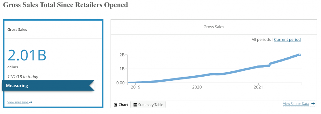 Gross sales from the state’s 165 cannabis retailers and three delivery services reached $2,009,007,478 as of August 31. That doubles the sales total that the commission reported last November, according to the state’s seed-to-sale tracking system.