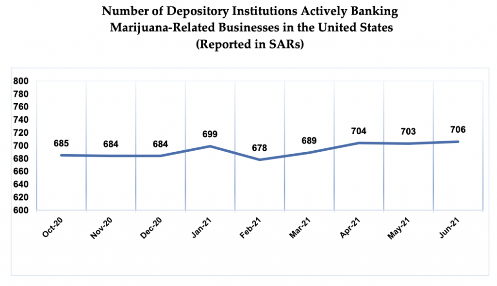 As of June 30, there were 706 financial institutions that had filed requisite reports saying they were actively serving cannabis clients. Thats up from 689 in the previous quarter but still down from a peak of 747 in late 2019.