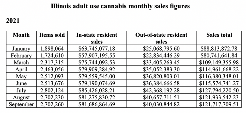 For September, there were $81,686,864 worth of cannabis purchases from in-state residents and $40,030,844 from out-of-state visitors, according to IDFPR. By contrast, the state’s recreational marijuana sales reached a total of $67,648,362 for both categories of consumers in September 2020.
