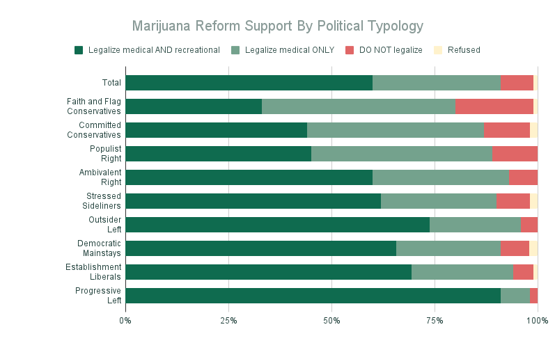 That’s the only right-leaning typology expressing majority support for adult-use and medical cannabis legalization. But two of the others—the Populist Right and Committed Conservatives—do hover just under the 50 percent mark. The exception is “Faith and Flag Conservatives,” only 33 percent of whom said they favor full legalization.