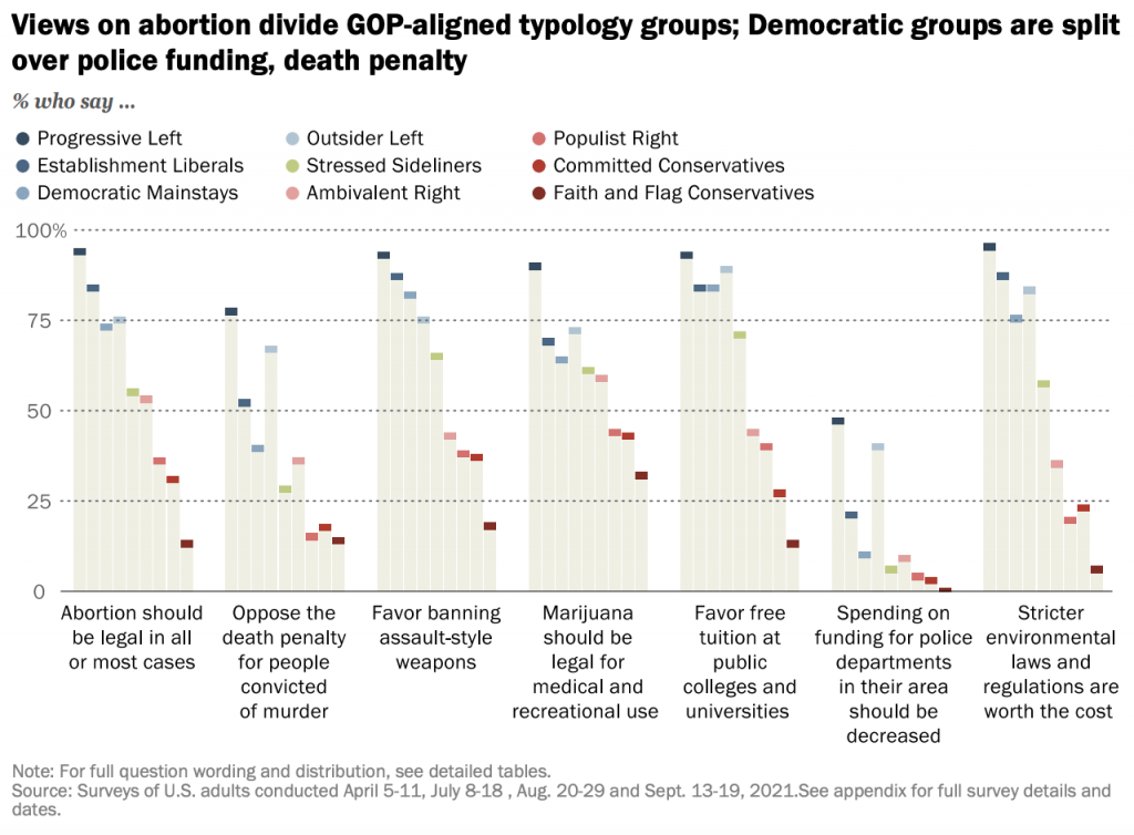 The Mainstays are “the largest Democratic-oriented group, as well as the oldest on average,” Pew said. The Progressive Left, meanwhile, “have very liberal views on virtually every issue and support far-reaching changes to address racial injustice and expand the social safety net.”