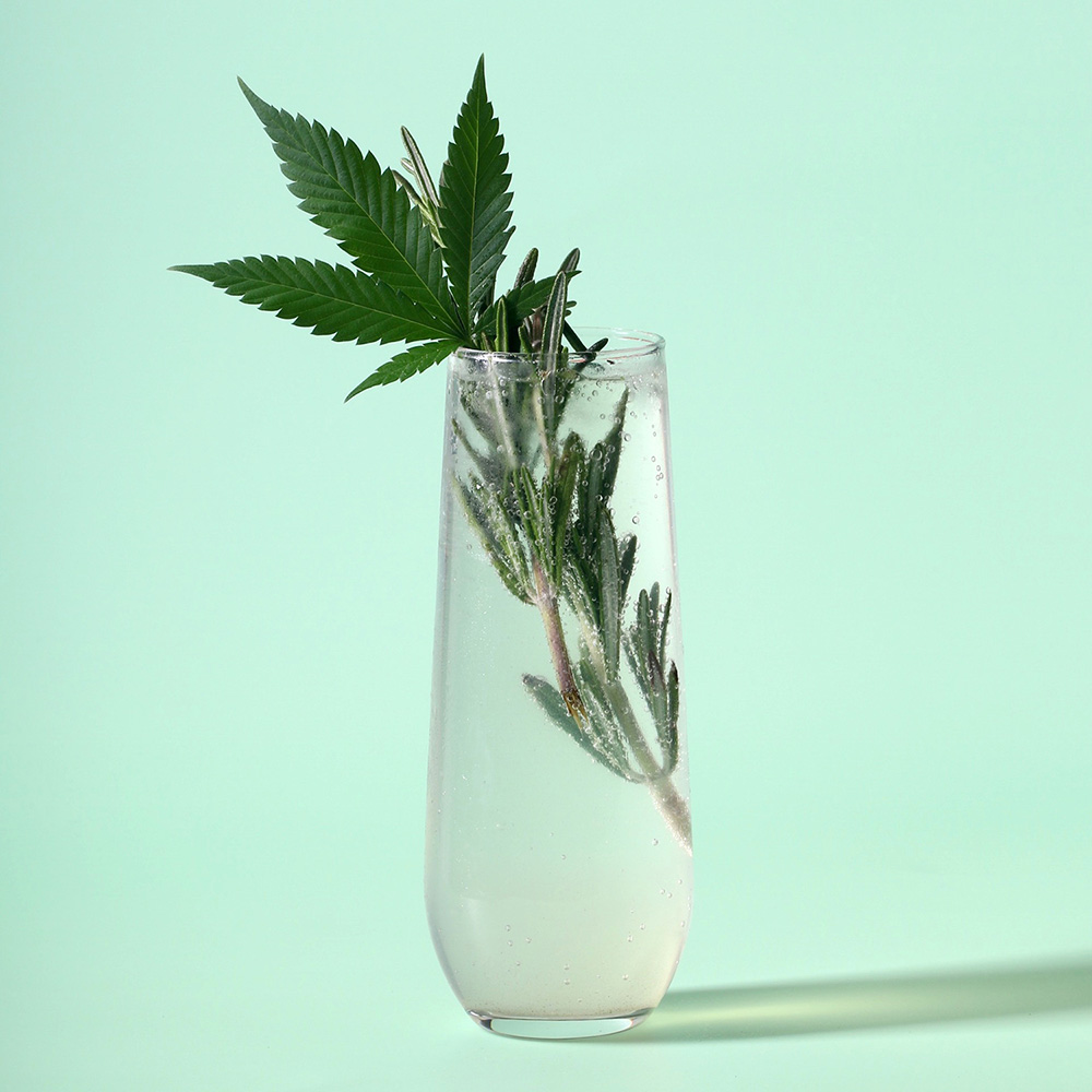 Add desired amount of the now cannabis-and-pine-needle-infused simple syrup to sparkling water over ice. Stir, garnish with a sprig of rosemary, and serve.