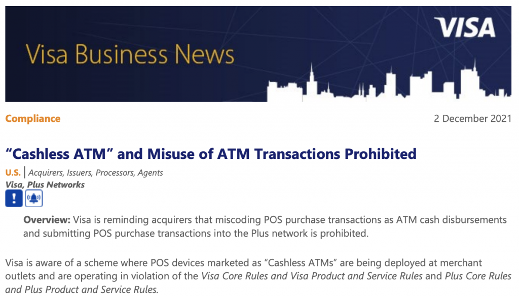 Visa’s compliance memo is brief when it comes to enforcement. Misuse of cashless ATMs “will be subject to non-compliance assessments and/or penalties” or “subject to further compliance enforcement,” it says, but doesn’t include details.