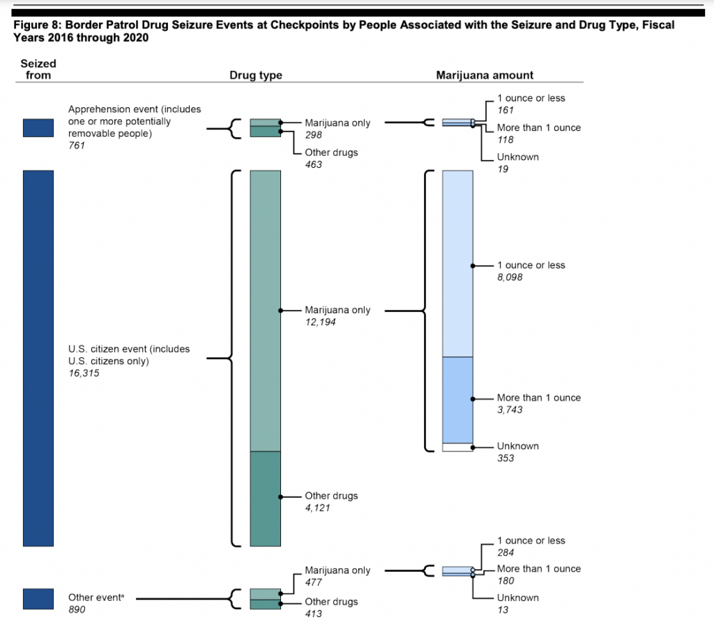 “About half of checkpoint events in which Border Patrol seized drugs from U.S. citizens (8,098 of 16,315) included the seizure of a personal use quantity of marijuana and no other drugs.”