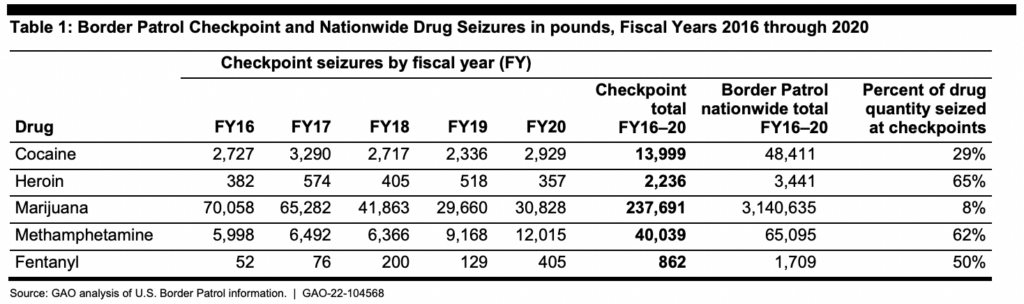 The office, which serves provides auditing and investigation services for Congress, analyzed Border Patrol data of 17,960 separate checkpoint seizure events from 2016 to 2020.