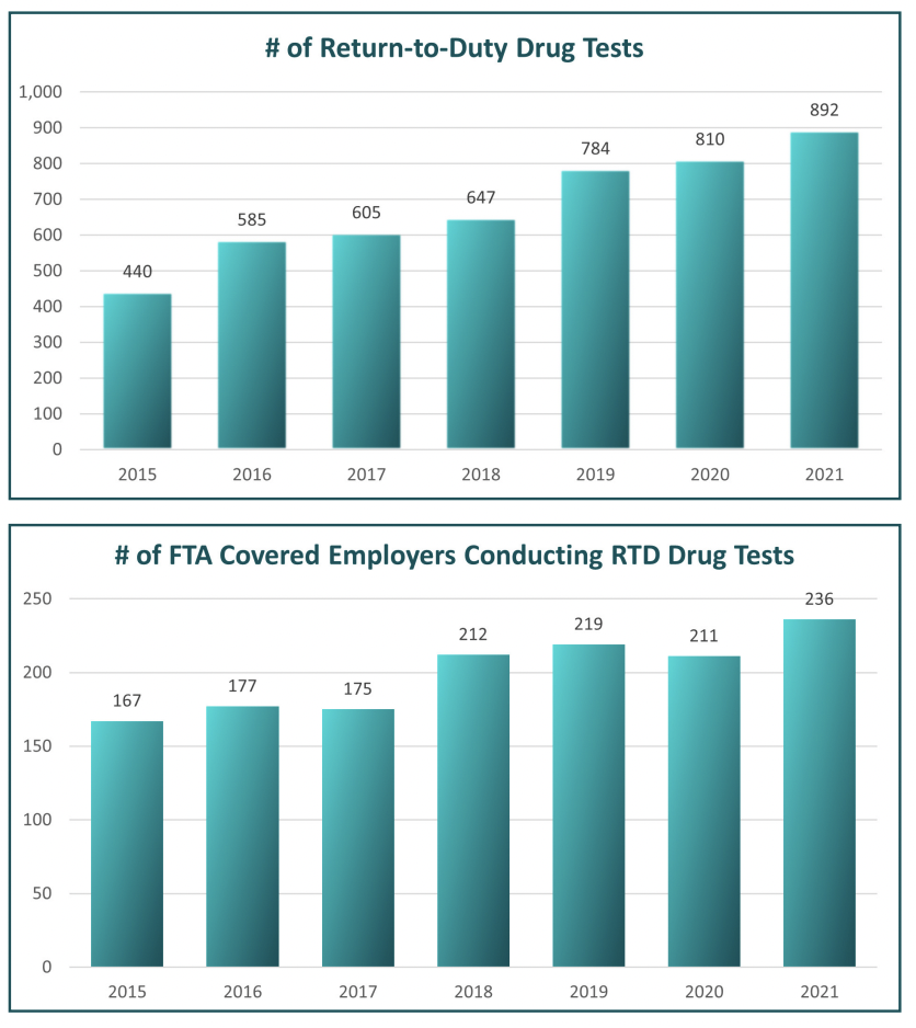 “One of the potentially telling statistics is the increase in both the number of Return-to-Duty (RTD) tests conducted and the number of FTA-covered employers performing this type of test,” it says. “This data indicates a trend toward a ‘second-chance’ policy versus a ‘zero tolerance’/termination policy following a DOT drug violation.”