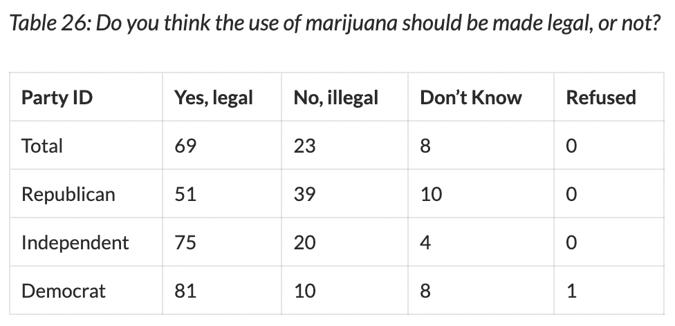Legalization of marijuana: Overall, 69% favor, 23% oppose. Among Republicans, 51% favor, 39% oppose, Among Democrats, 81% favor, 10% oppose. Among independents, 75% favor, 20% oppose. #mulawpoll