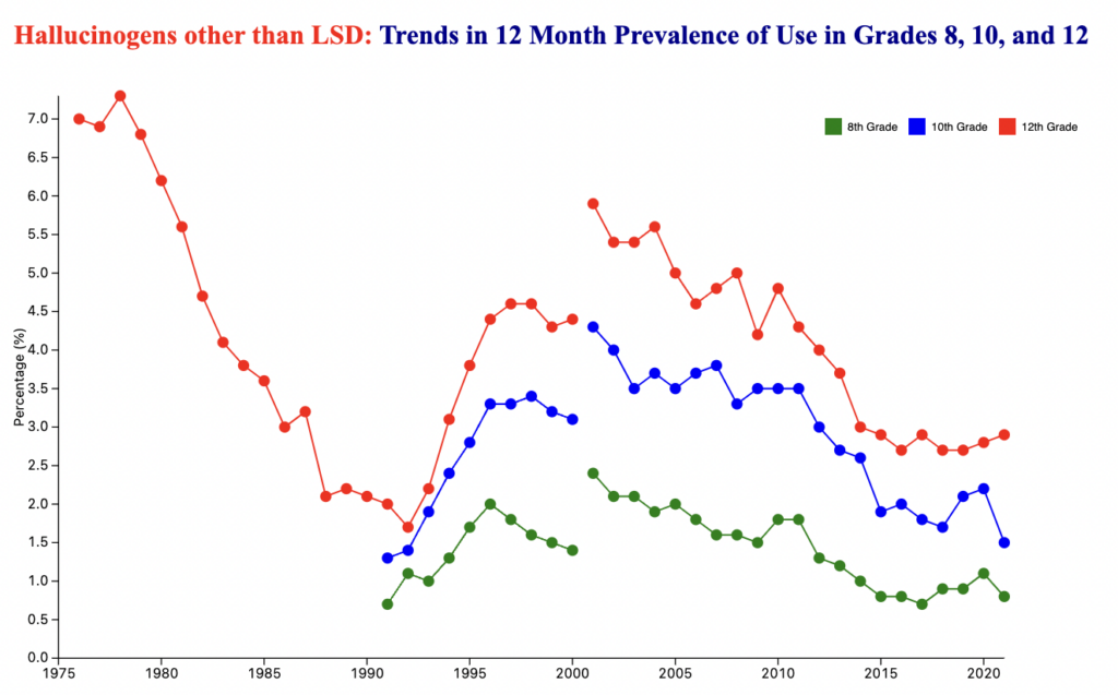“Past-year hallucinogen use had been relatively stable over the past few decades until 2020, when reports of use started to increase dramatically,” a summary of the MTF report says. “In 2021, eight percent of young adults reported past-year hallucinogen use, representing an all-time high since the category was first surveyed in 1988. By comparison, in 2016, five percent of young adults reported past-year hallucinogen use, and in 2011, only three percent reported use.”