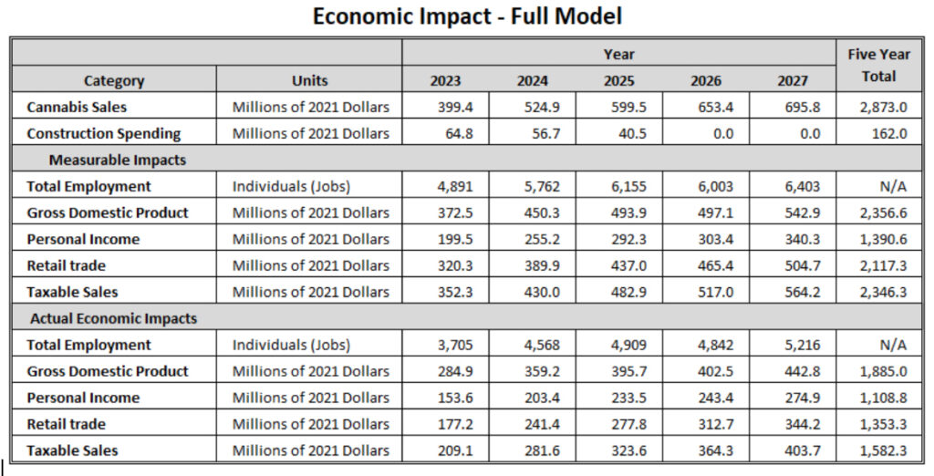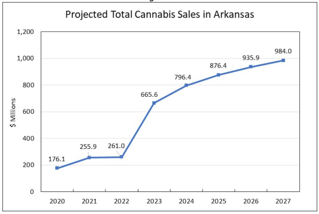 The five-year analysis found that Arkansas could see yearly sales reaching $984 million by 2027. Over the full half-decade scope of the projection, there would be $163.1 million in revenue the standard state sales tax on marijuana purchases alone. That’s in addition to the estimated $303.6 million in revenue from the supplemental 10 percent cannabis tax imposed under the proposed constitutional amendment.
