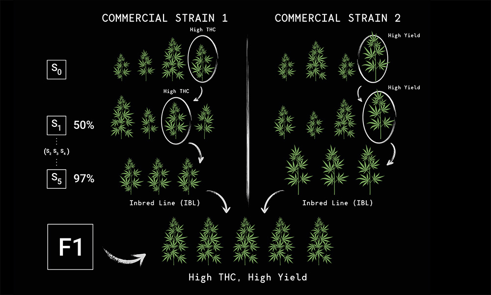 The RQS team started developing the F1 hybrid seeds in 2019 when the bank created its first pure inbred lines (IBLs), a technique the vegetable industry used for decades to create uniform produce. Breeders select two plants (or lines) with desirable qualities—for example, high yields or particular terpene profiles—and then intentionally mate the plants together. Once confident they had created the optimum traits, RQS applied the same technology to cross its IBLs, creating the new genetics.