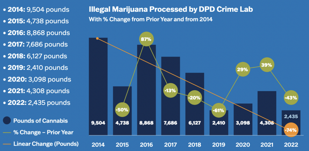 According to the report, police in the city processed 2,435 pounds of illegal marijuana in 2022—down 74 percent since the first retailers opened. It’s possible that in addition to being largely driven by a reduced demand for unregulated products, some of the decline in seizures is attributable to police de-prioritizing cannabis enforcement in the legal environment.