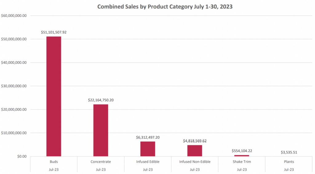 The lion’s share of the sales involved cannabis flower, which exceeded $50 million. That was followed by concentrates, infused edibles, infused non-edibles, shake trim and plants.