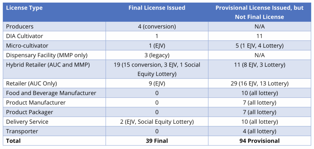 Another 94 provisional licenses were issued by regulators across all license types during the first year of operations. Those licenses expire after 14 to 24 months, depending on when they were issued.