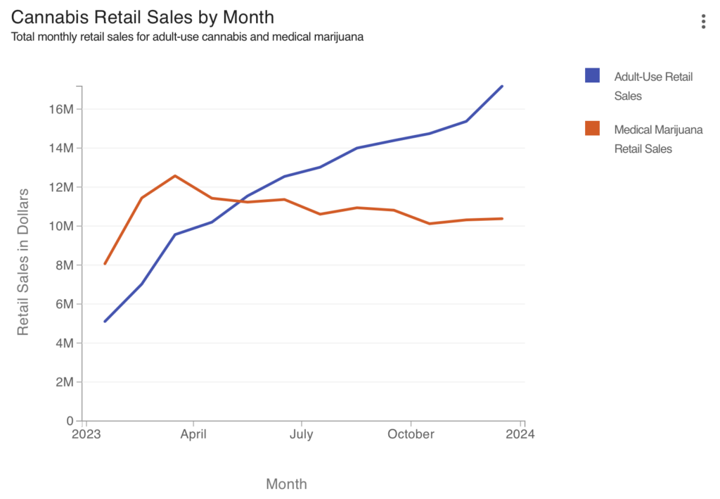 Sales data for the preexisting medical market alone are not available prior to January 10, 2023, when adult-use sales began, the department said.