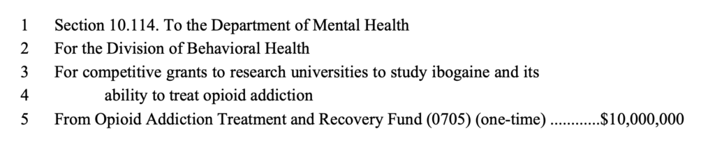 A previous version would have put $10 million toward “competitive grants to research universities to study ibogaine and its ability to treat opioid addiction,” but “ibogaine” was replaced with “psilocybin.”