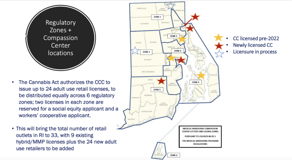 Under the Rhode Island Cannabis Act, retail licenses must be spread throughout six geographic zones, with a maximum of four stores per zone. Of those four, two are reserved for a social equity applicant and a workers’ cooperative.